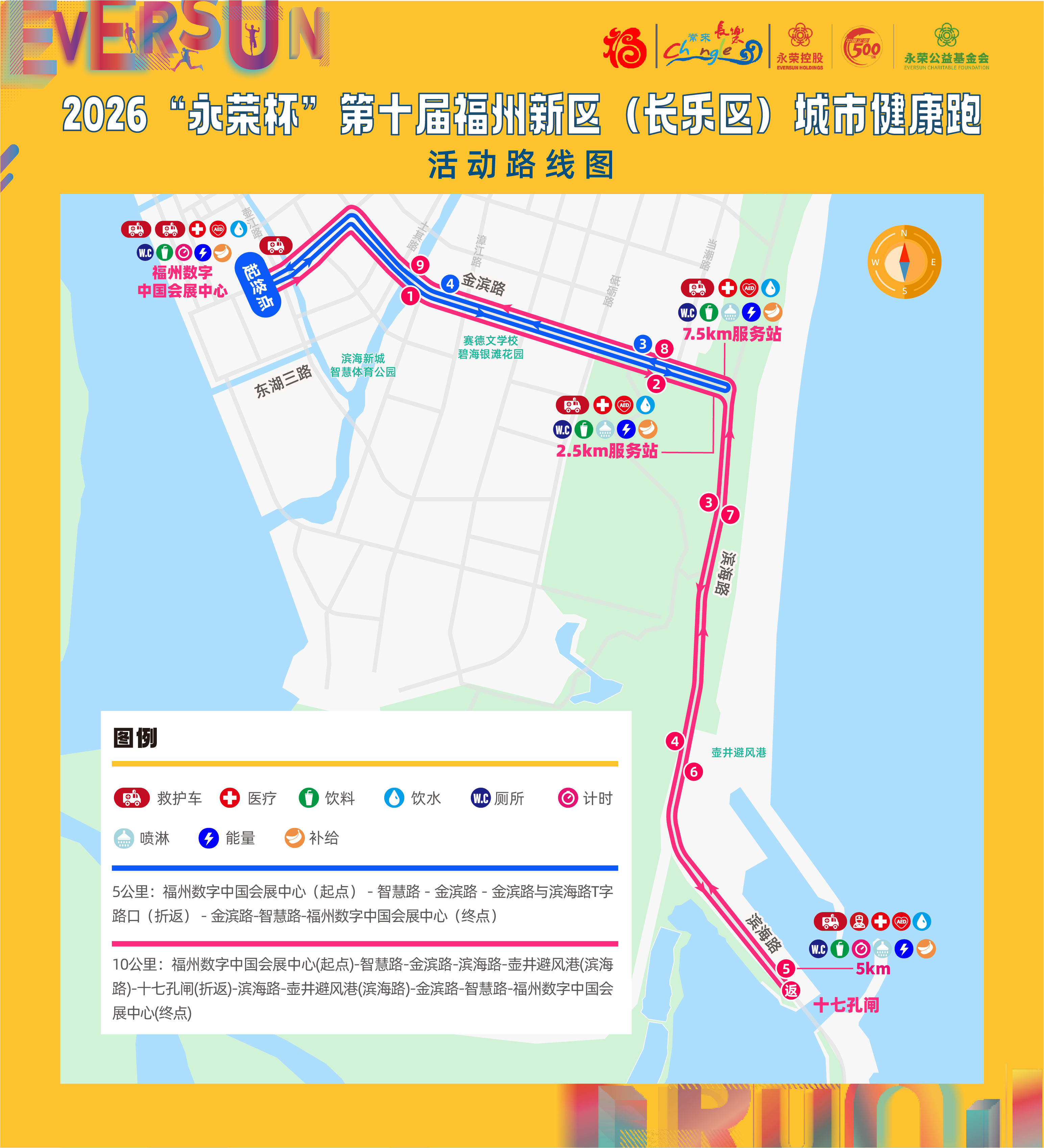 (2)5公里组:福州数字中国会展中心(起点)-智慧路-金滨路-金滨路与滨海路T字路口(折返)-金滨路-智慧路-福州数字中国会展中心(终点)